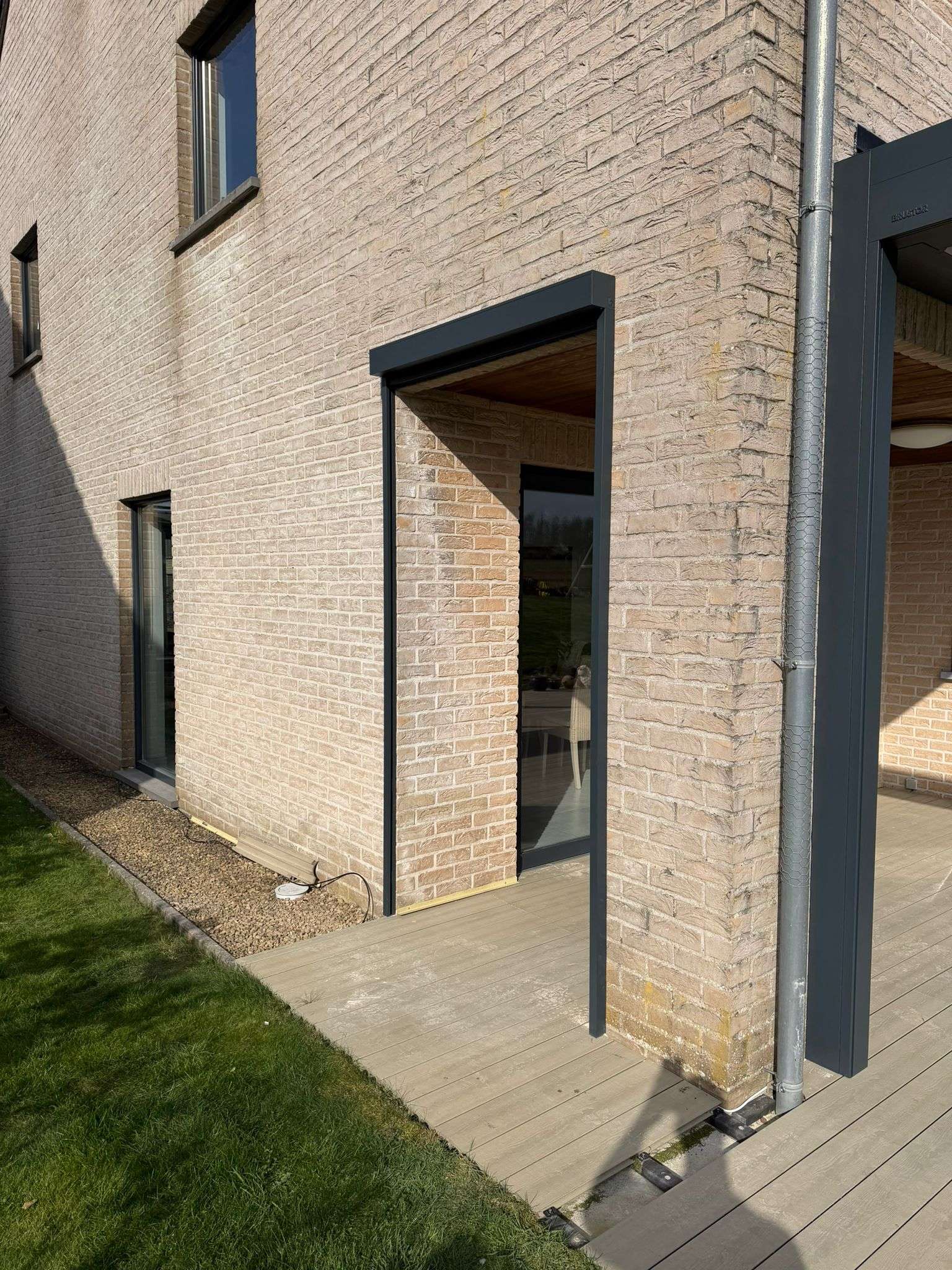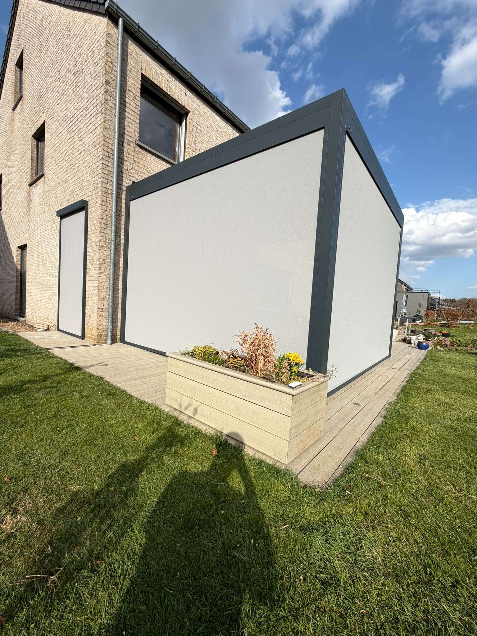 Pour compléter la pergola, un screen vient s’implémenter directement au dessus du passage extérieur, permettant de supprimer au besoin le couloir de vent.